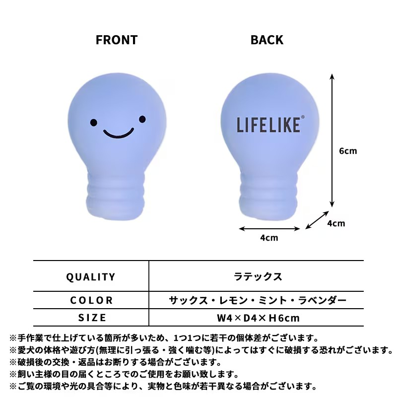 電球がおもちゃになっちゃった!?ペールカラーメ愛らしい表情がとってもキュート!小さなワンちゃんたちも遊びやすい、手のひらサイズのおもちゃです。ワンちゃんたちが大好きな、「ピーピー」と高い音が鳴る笛入り♪持ってこい遊びも飽きずに長く楽しめます。やわらかい天然ゴム製のラテックスを使用しています。歯や歯ぐきに優しく、安心して長く遊ぶことができます。自然由来なのも嬉しいポイント♪※小さく柔らかい商品です。誤飲の危険がありますので使用時には目を離さないでください。大型のワンちゃんには与えないでください。