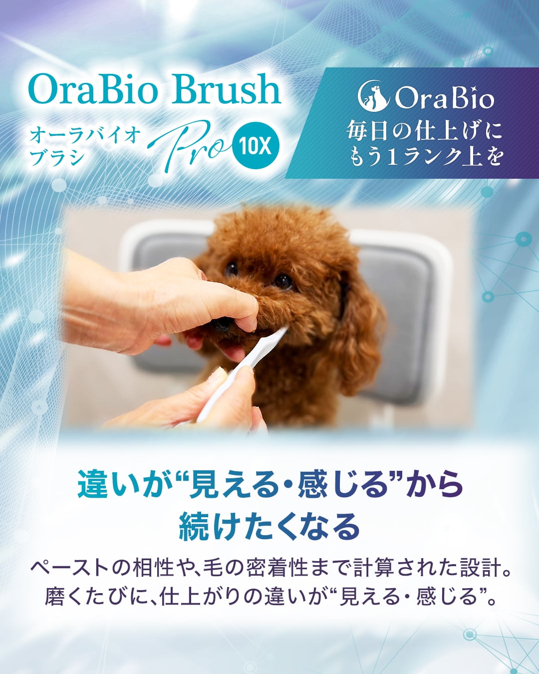 オーラバイオブラシ PRO 10X。羽のようにやさしいのに、しっかり磨ける。歯科衛生士が推奨するプロ仕様の犬猫用歯ブラシです。